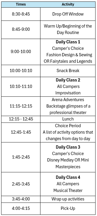Arena Stage reserves the right to cancel a program due to enrollment or other circumstances. All efforts will be made to give participants ample warning. If Camp Arena Stage must cancel a session in full before the session starts, we will fully refund tuition. If we must cancel once a session has started, refunds will be pro-rated.